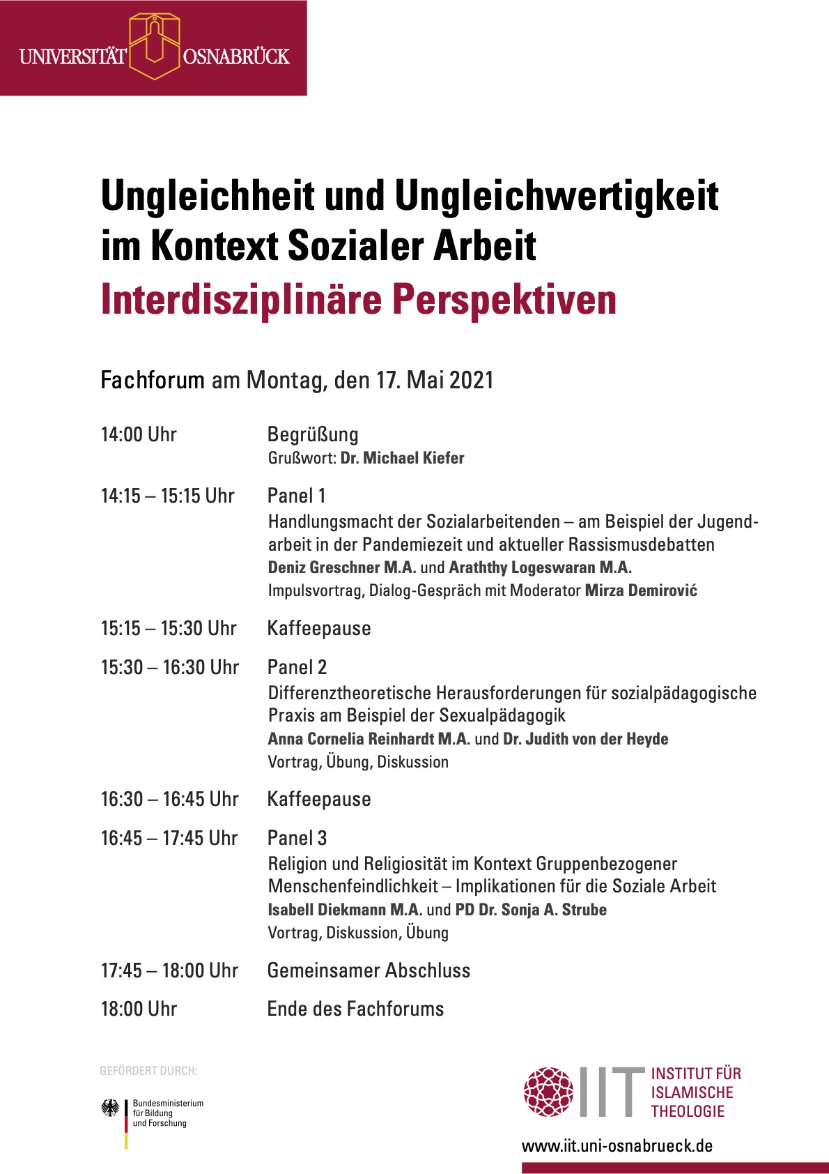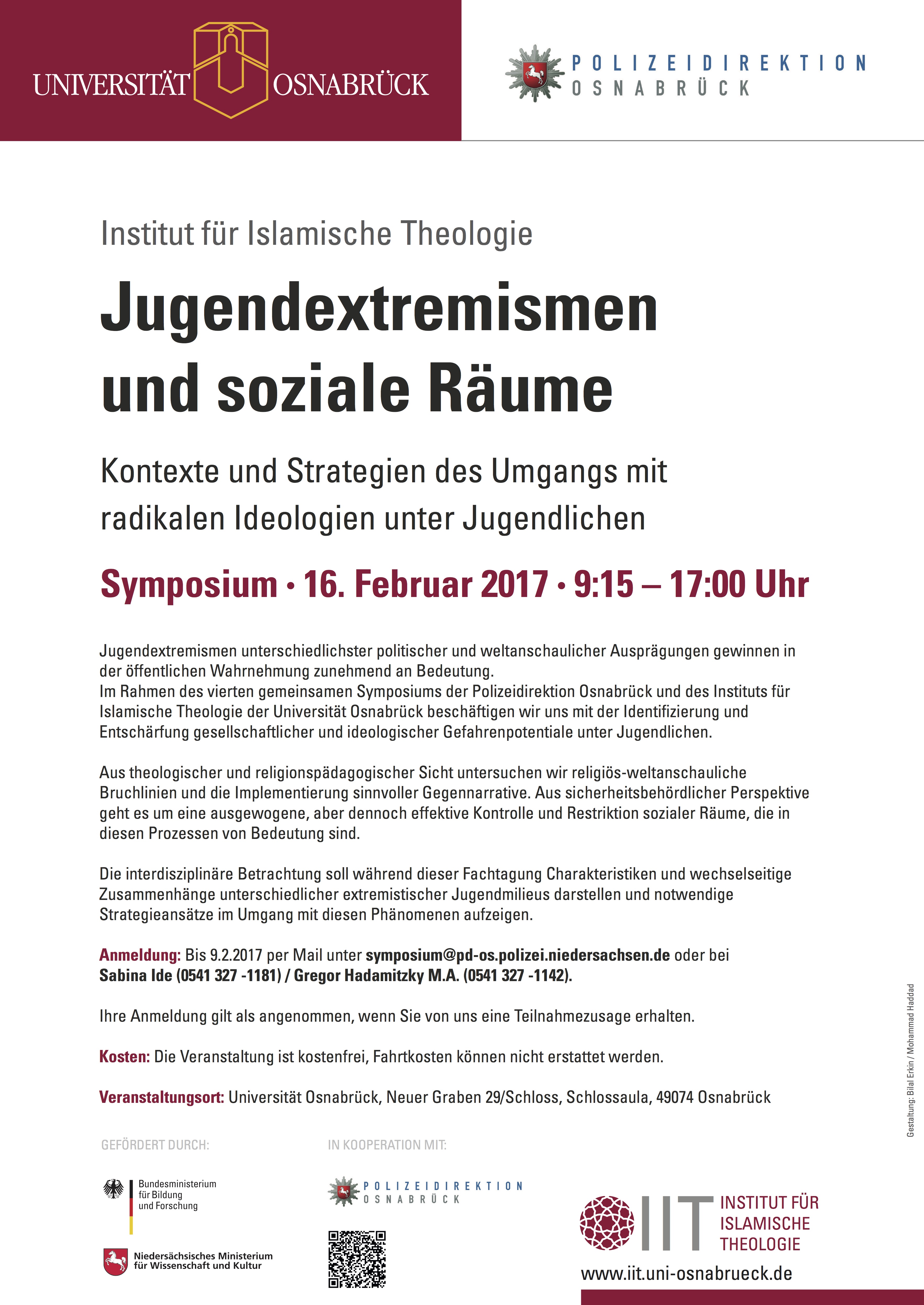 - 16.02.2017 | Jugendextremismen und soziale Räume. Kontexte und Strategien des Umgangs mit radikalen Ideologien unter Jugendlichen. Fachtagung des Instituts für Islamische Theologie an der Universität Osnabrück in Kooperation mit dem Polizeipräsidium Osnabrück