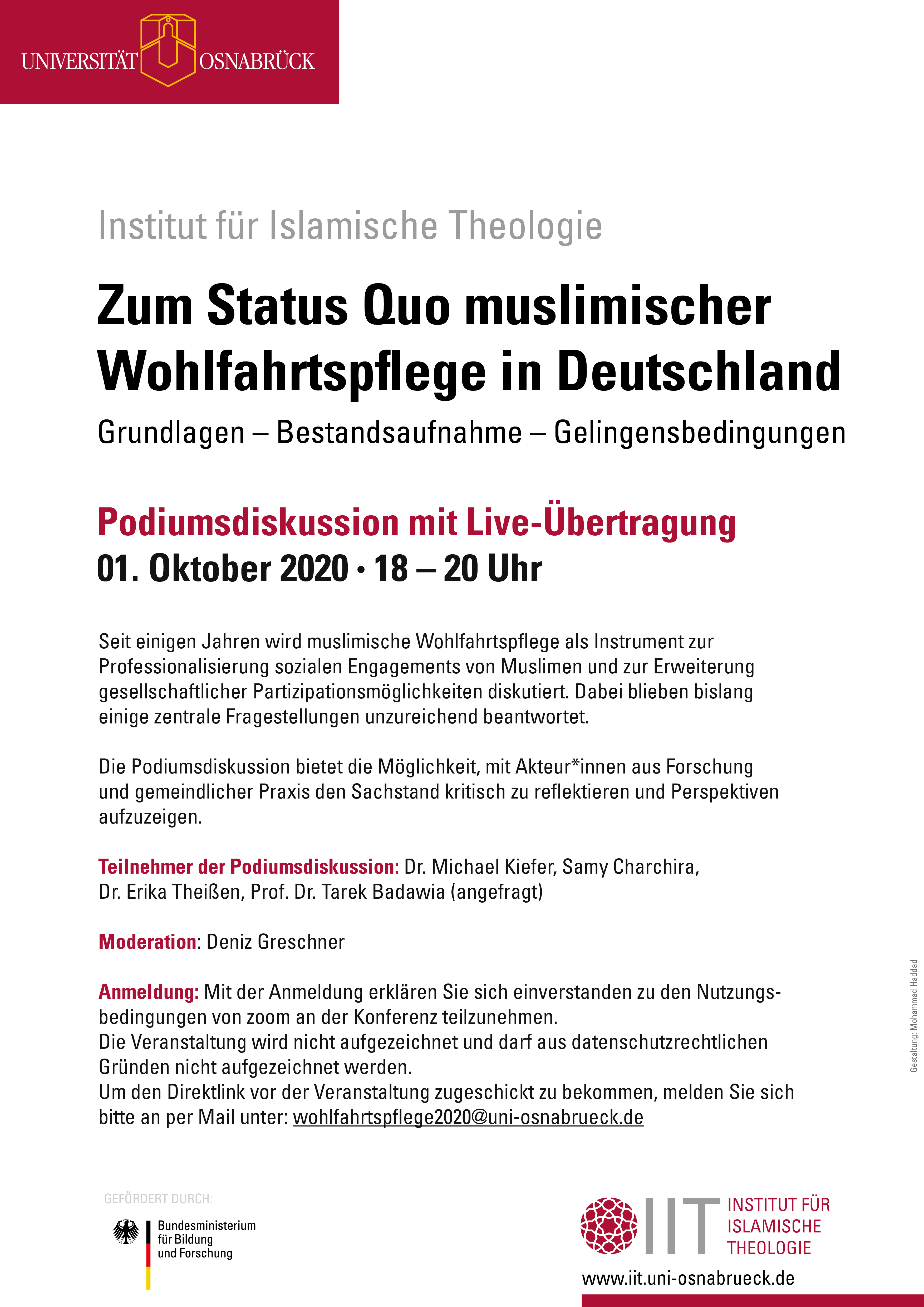 - 01.10.2020 | Zum Status Quo muslimischer Wohlfahrtspflege in Deutschland. Grundlagen – Bestandsaufnahme – Gelingensbedingungen. Podiumsdiskussion des Instituts für Islamische Theologie an der Universität Osnabrück