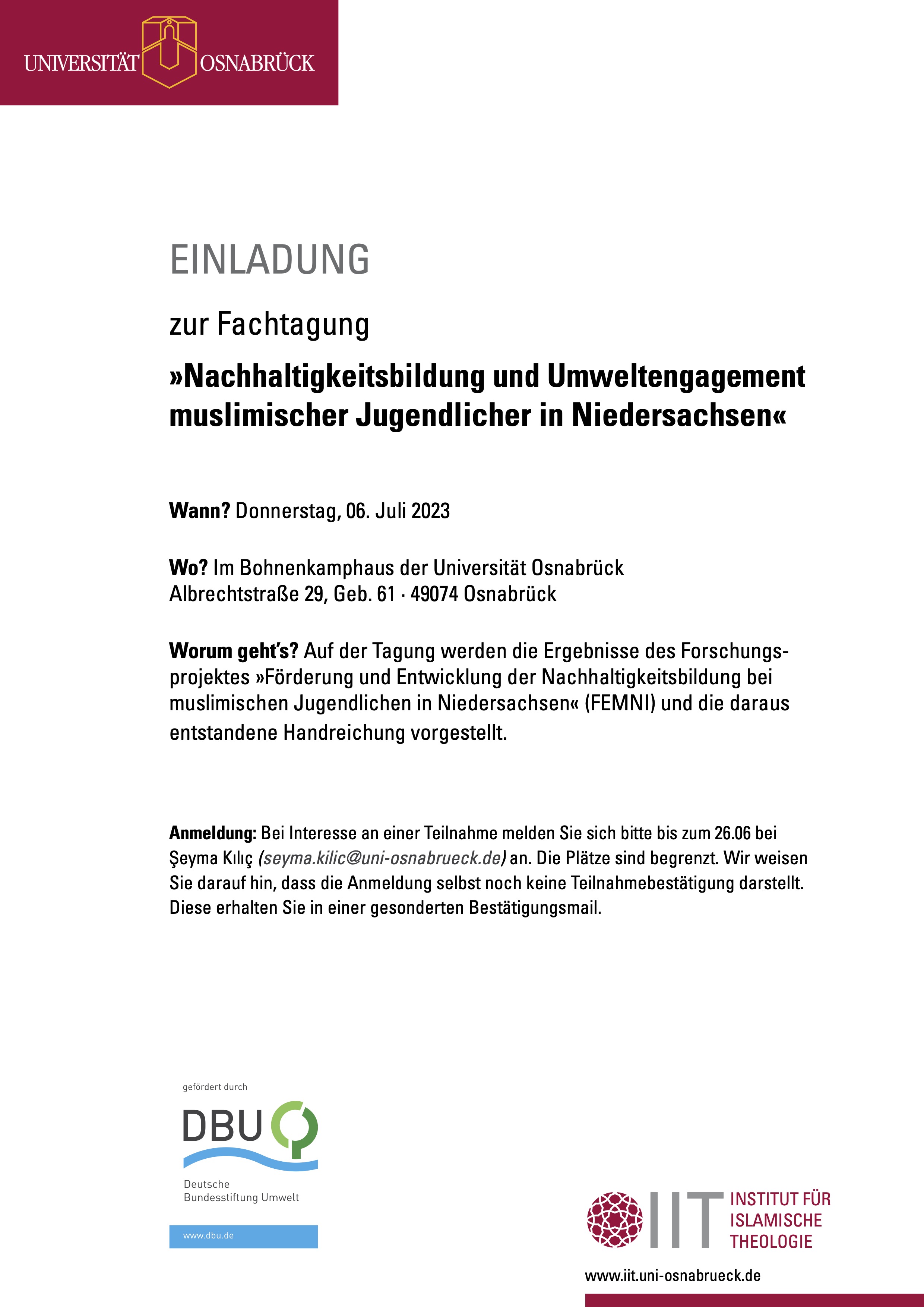 - 04.-06.06.2020 | Gender und Islam. Perspektiven europäisch-islamischer Theologinnen und Theologen. Fachtagung des Instituts für Islamische Theologie an der Universität Osnabrück