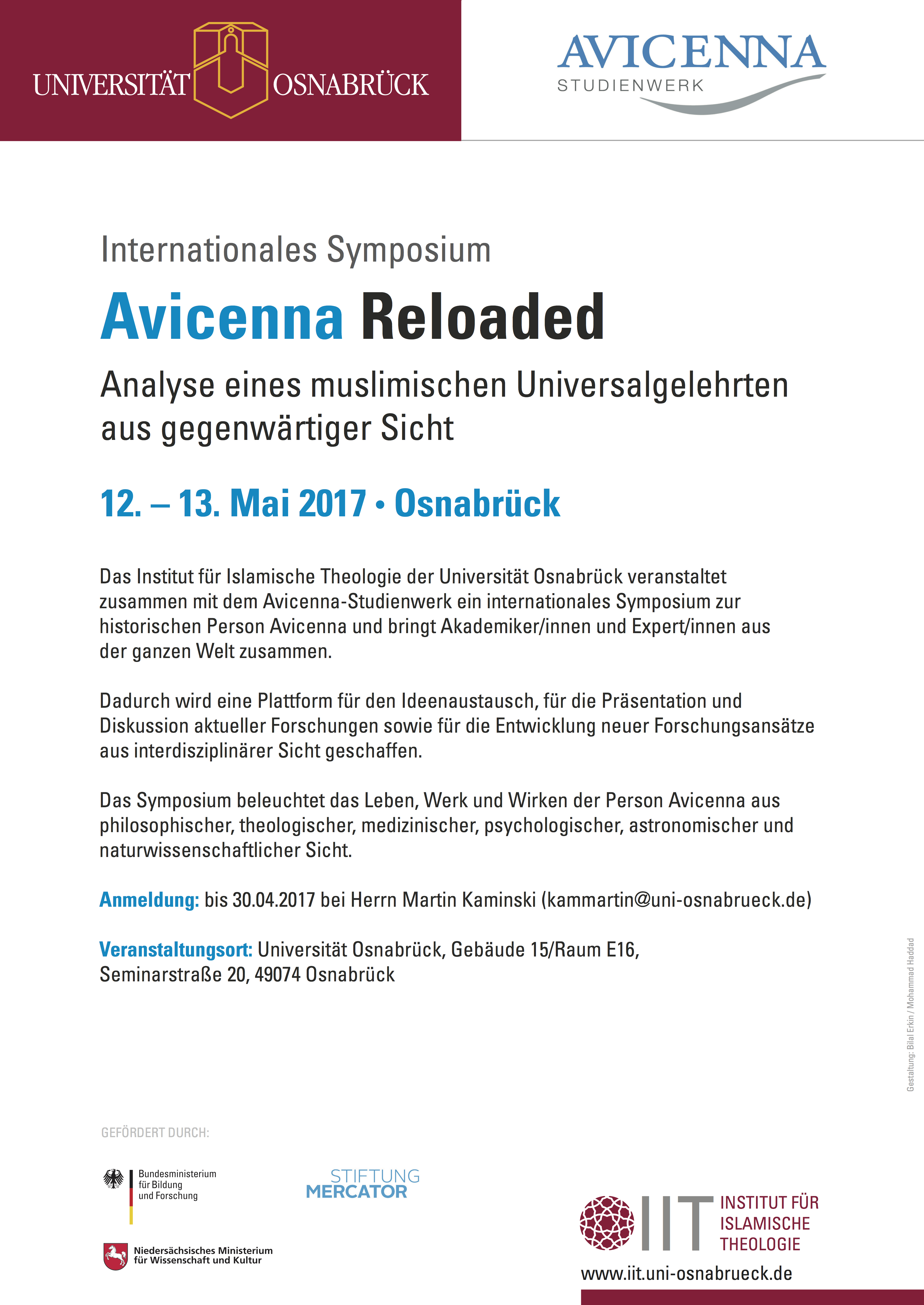 - 12.-13.05.2017 | Avicenna Reloaded - Analyse eines muslimischen Universalgelehrten aus gegenwärtiger Sicht. Tagung des Instituts für Islamische Theologie an der Universität Osnabrück